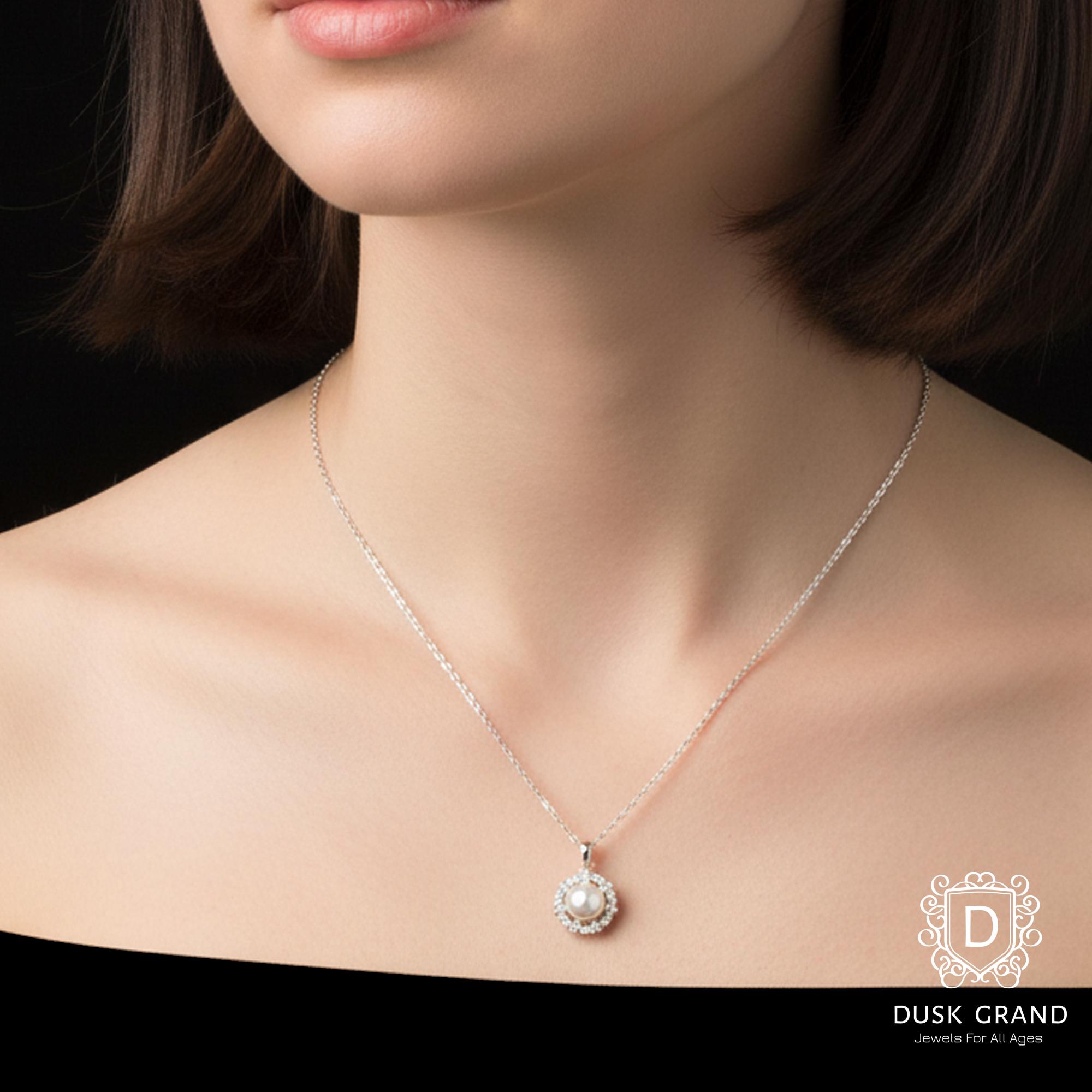 This pearl pendant necklace brings timeless beauty to any look. The design features a luminous round pearl at the center, surrounded by sparkling cubic zirconia stones in a delicate halo setting. Suspended on a silver tone chain, it offers a sophisticated style that’s perfect for everyday wear or special occasions.