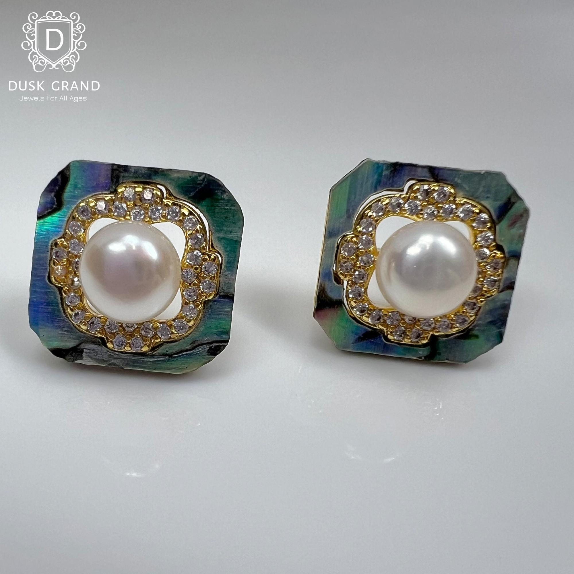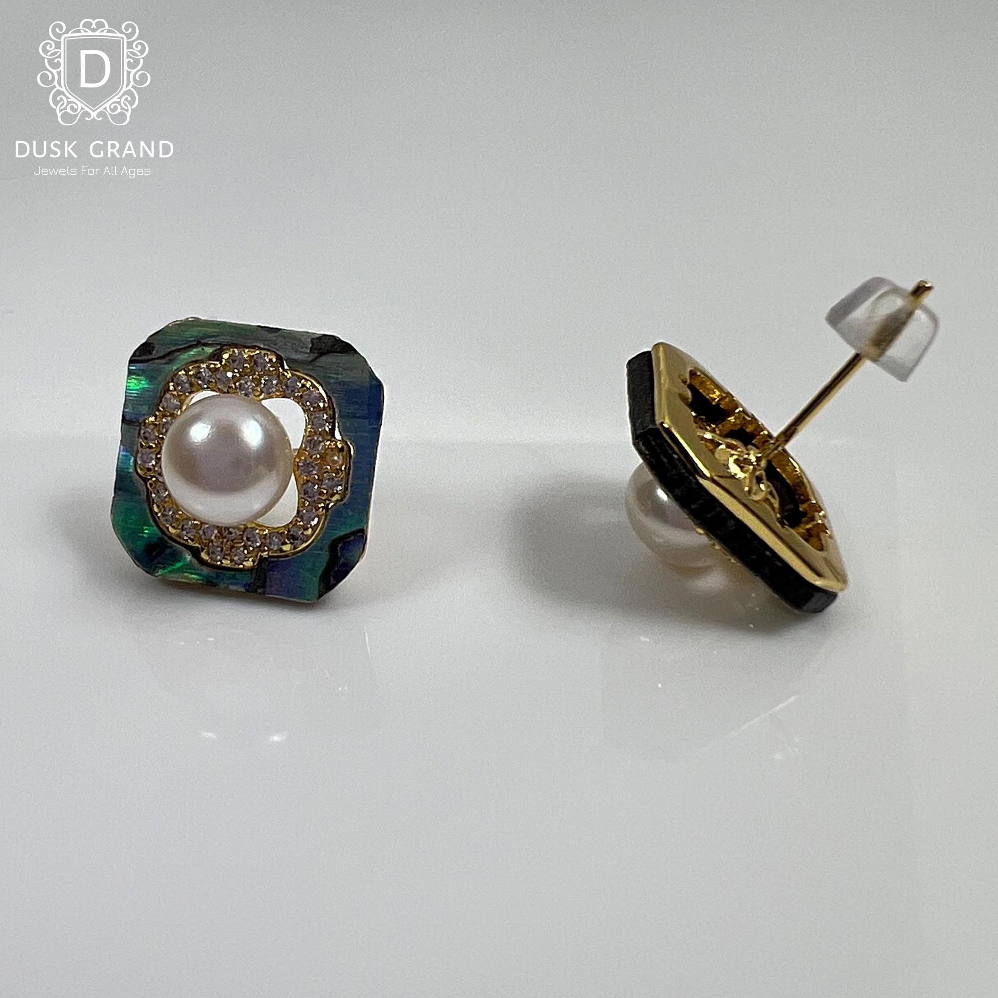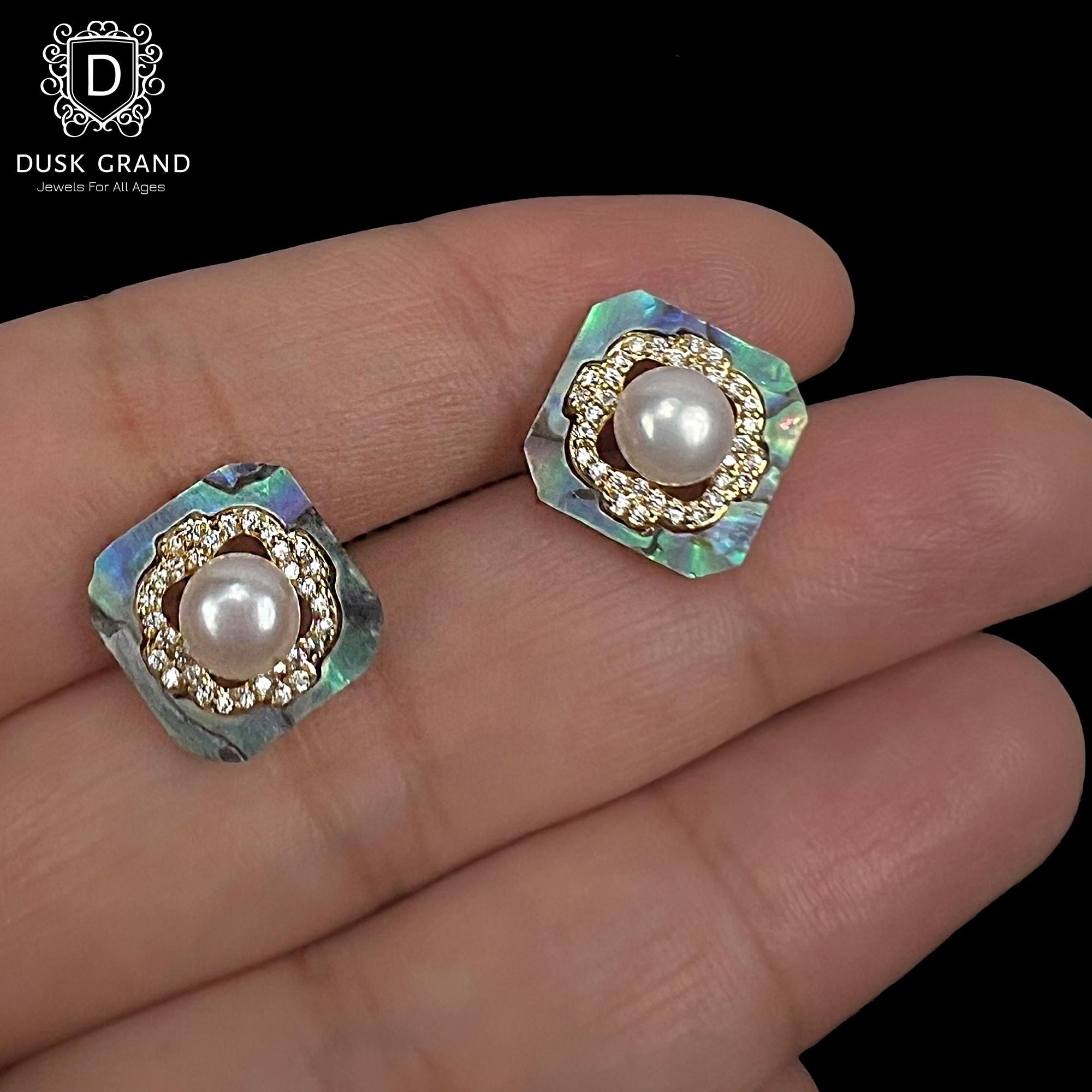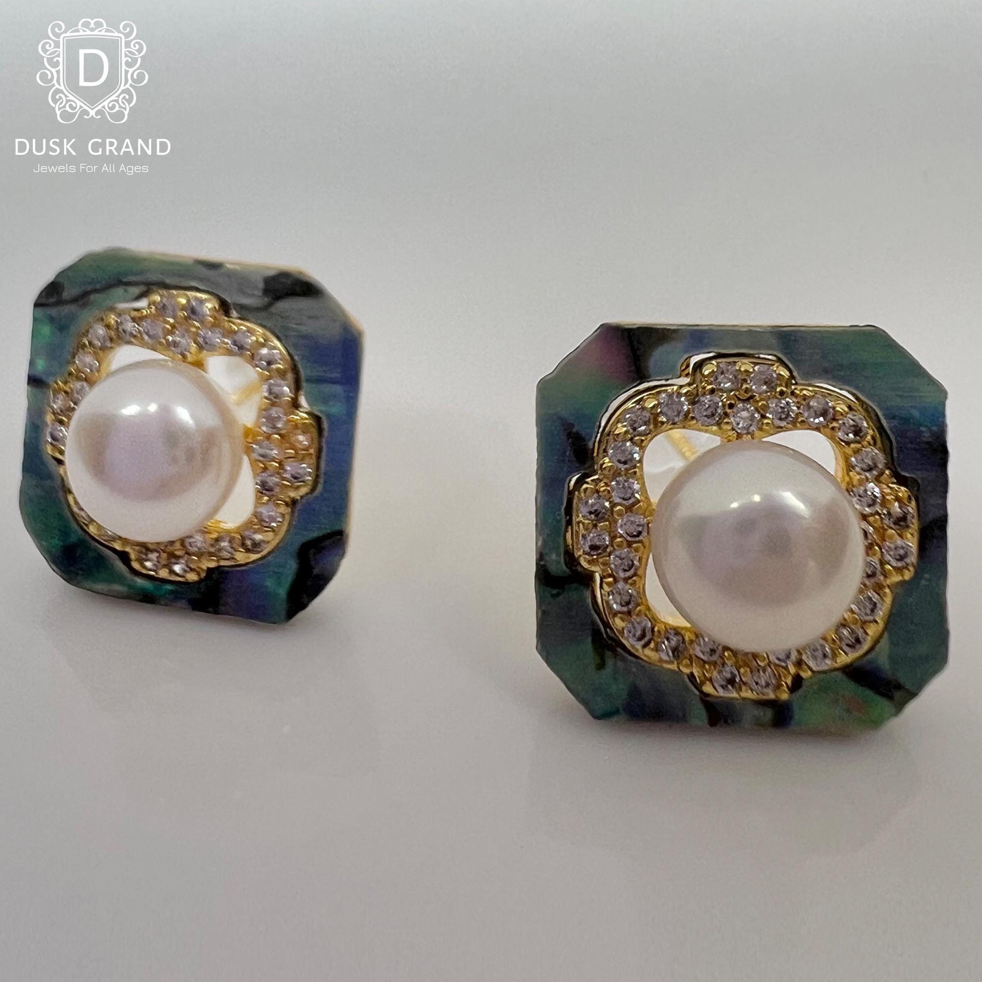 Add a refined sparkle to your look with these square pearl stud earrings in a stunning gold tone finish. The earrings feature a lustrous center pearl encircled by sparkling cubic zirconia stones and a shimmering pearlescent-painted base that reflects beautiful iridescent hues under light.