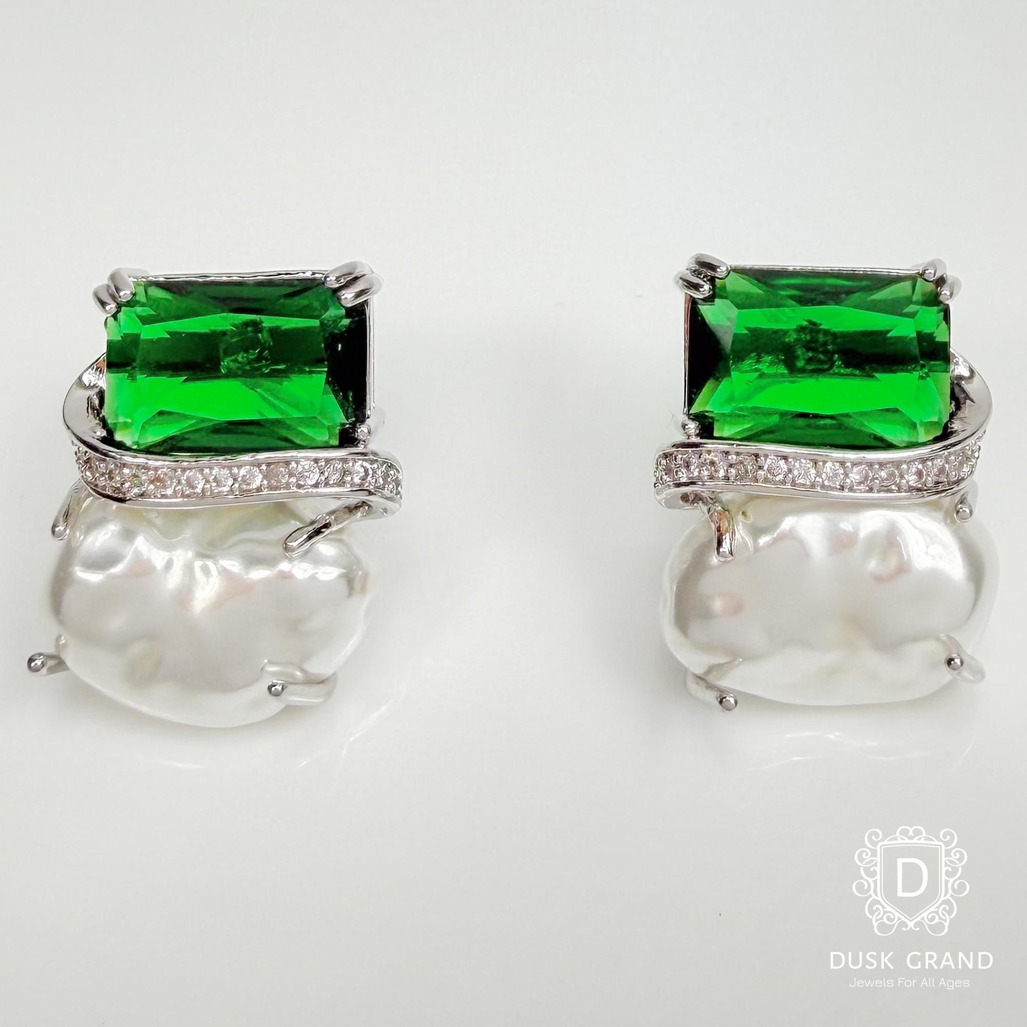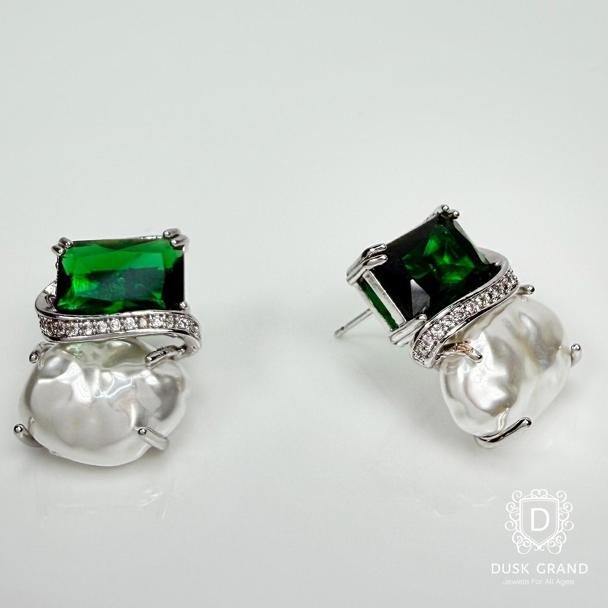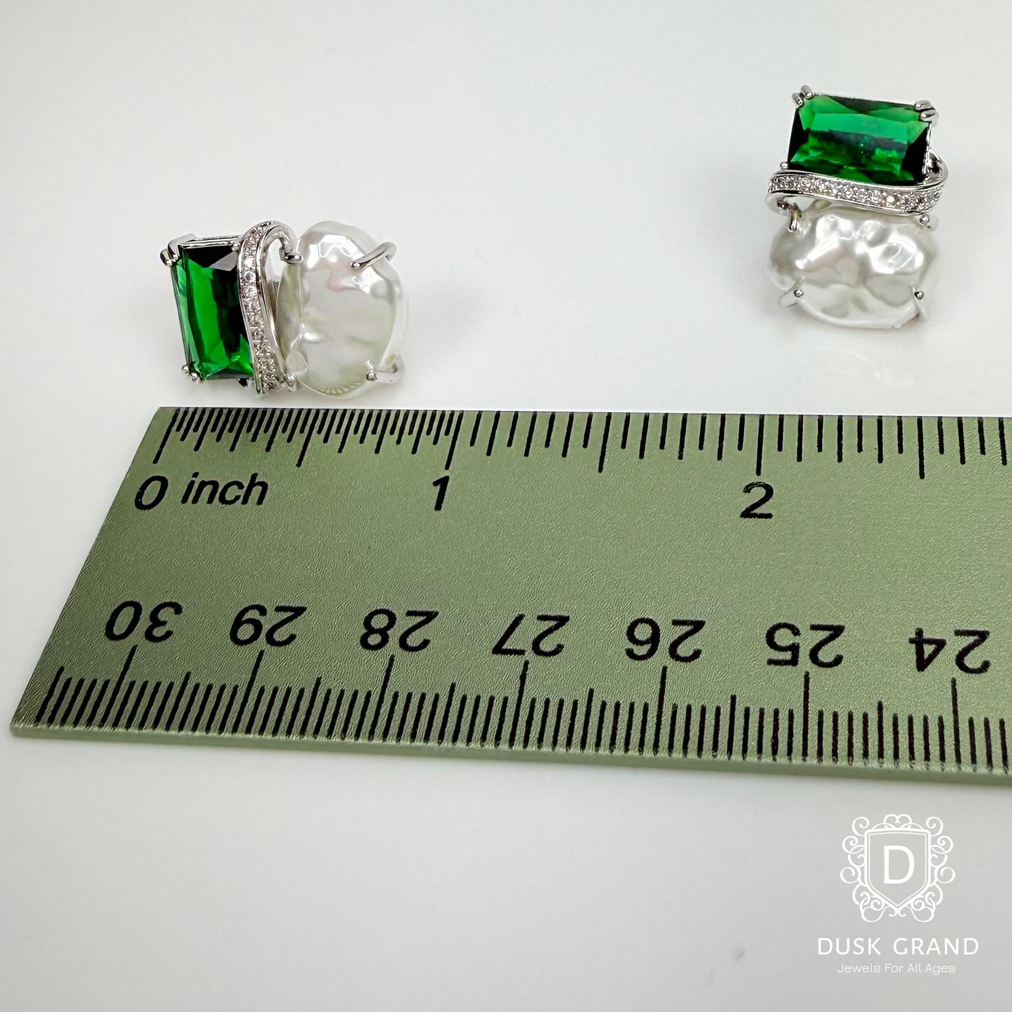 Add refined elegance to your style with these green crystal and baroque pearl earrings. Each earring showcases a deep emerald-green crystal paired with a natural baroque pearl — creating a luxurious contrast of color and texture.