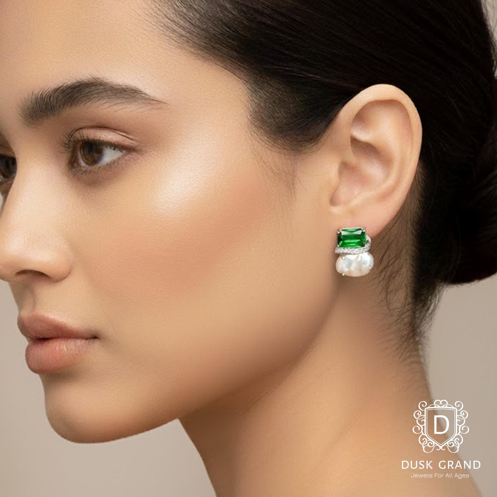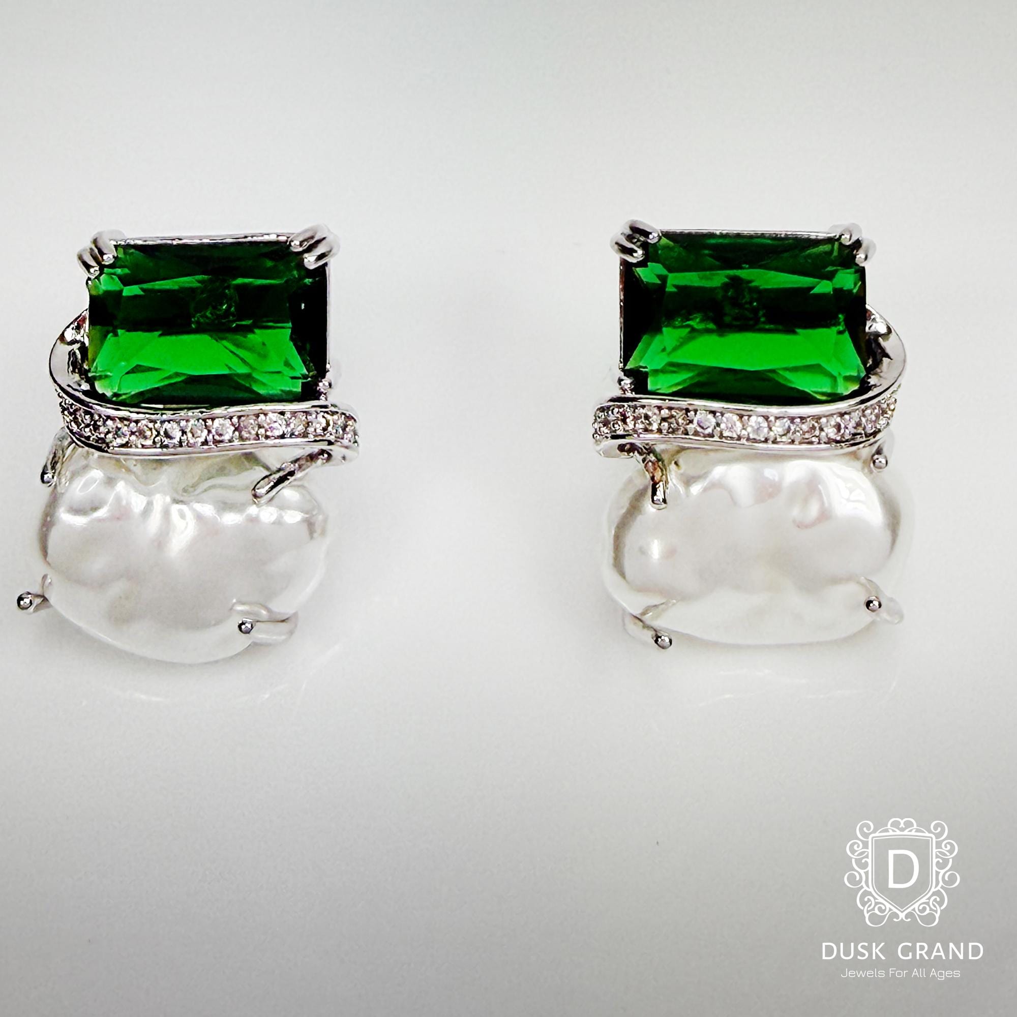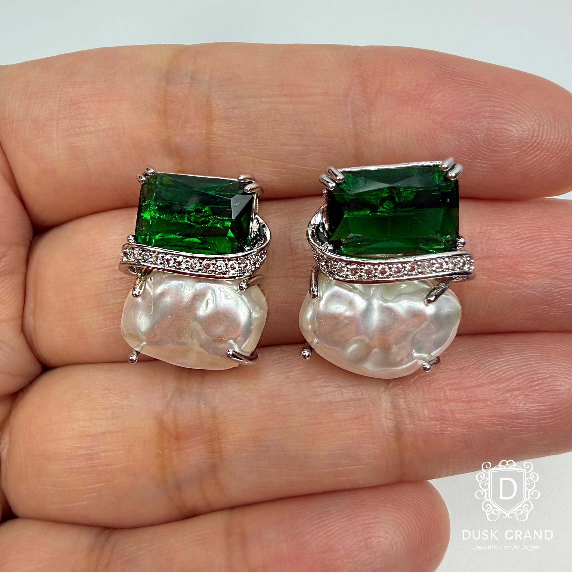 Add refined elegance to your style with these green crystal and baroque pearl earrings. Each earring showcases a deep emerald-green crystal paired with a natural baroque pearl — creating a luxurious contrast of color and texture.
