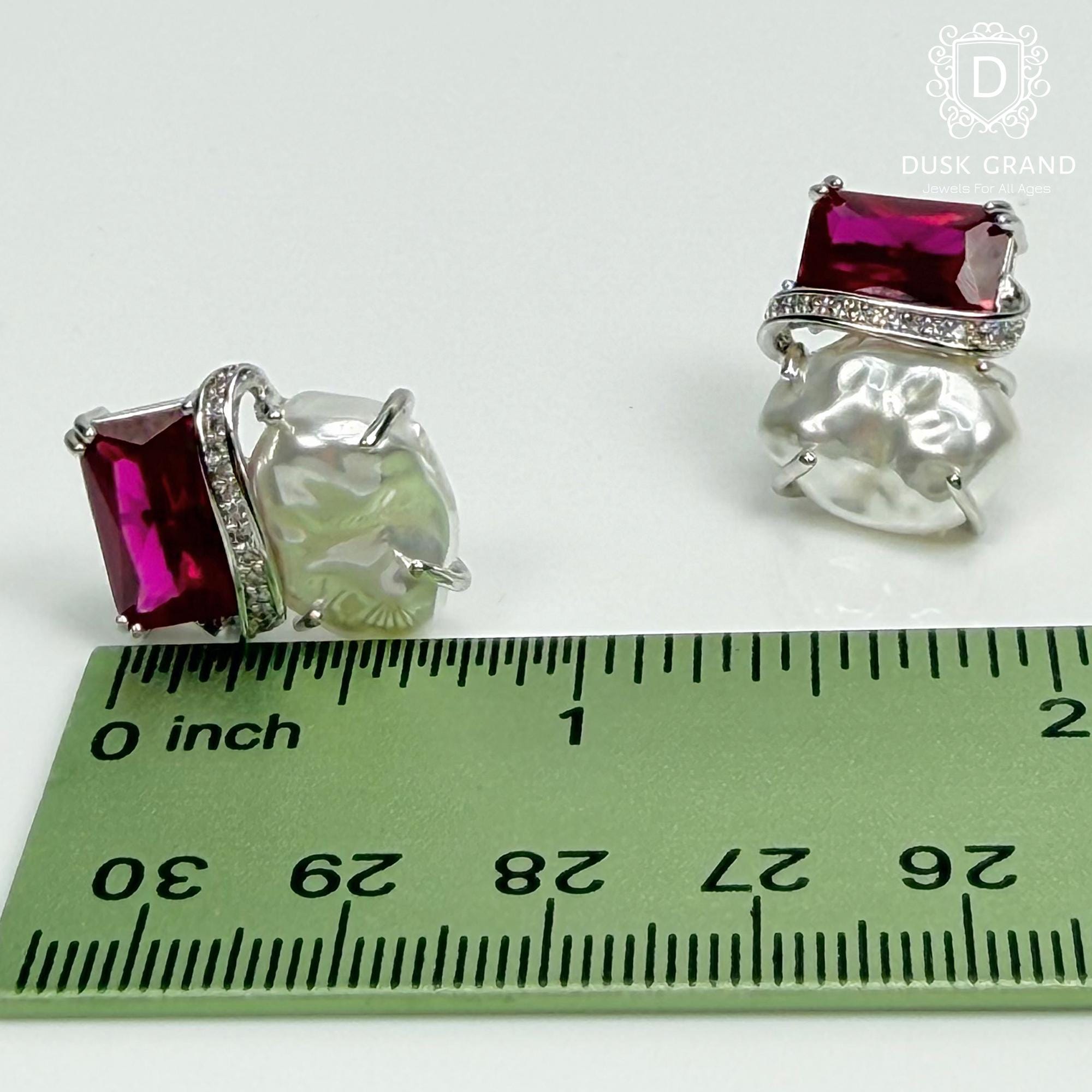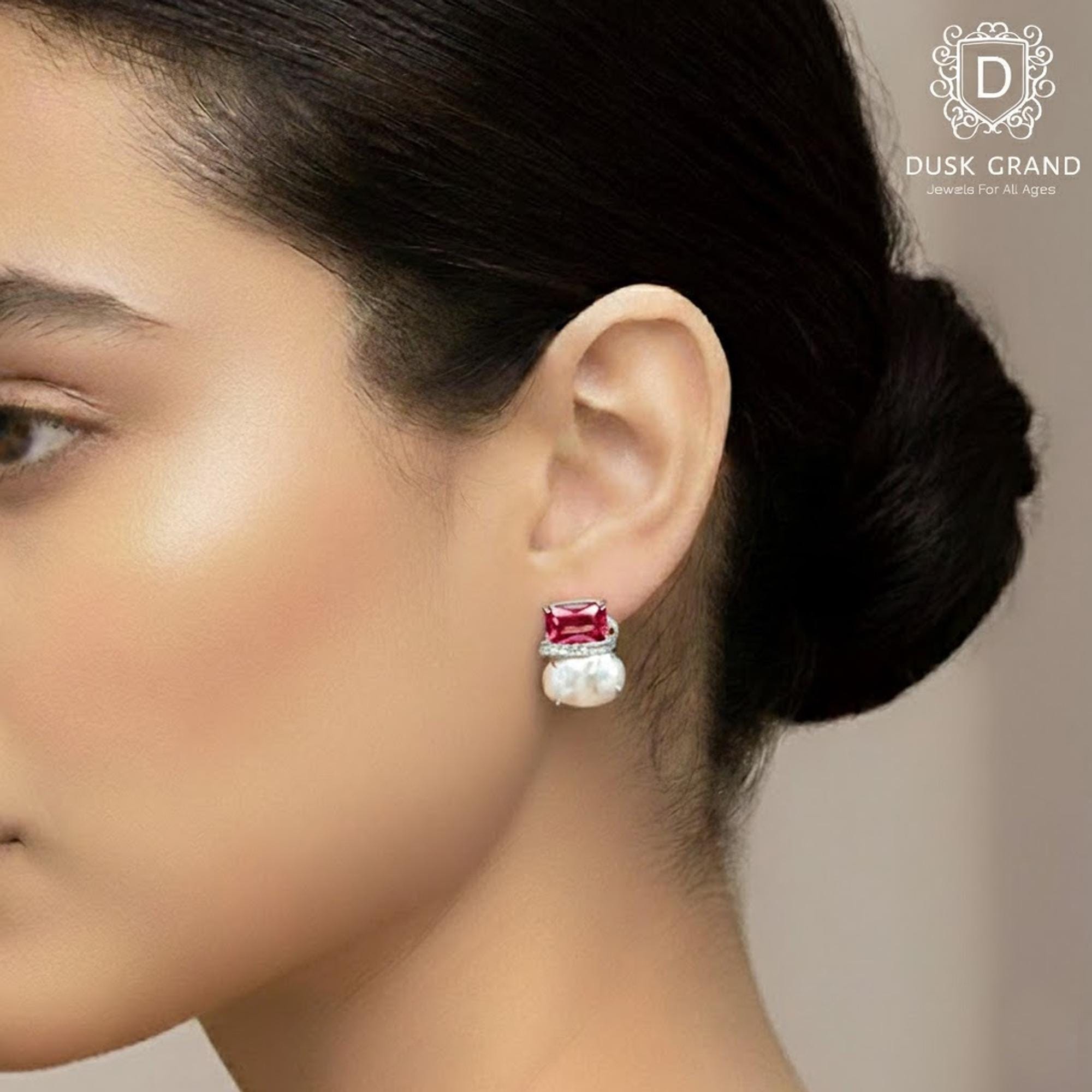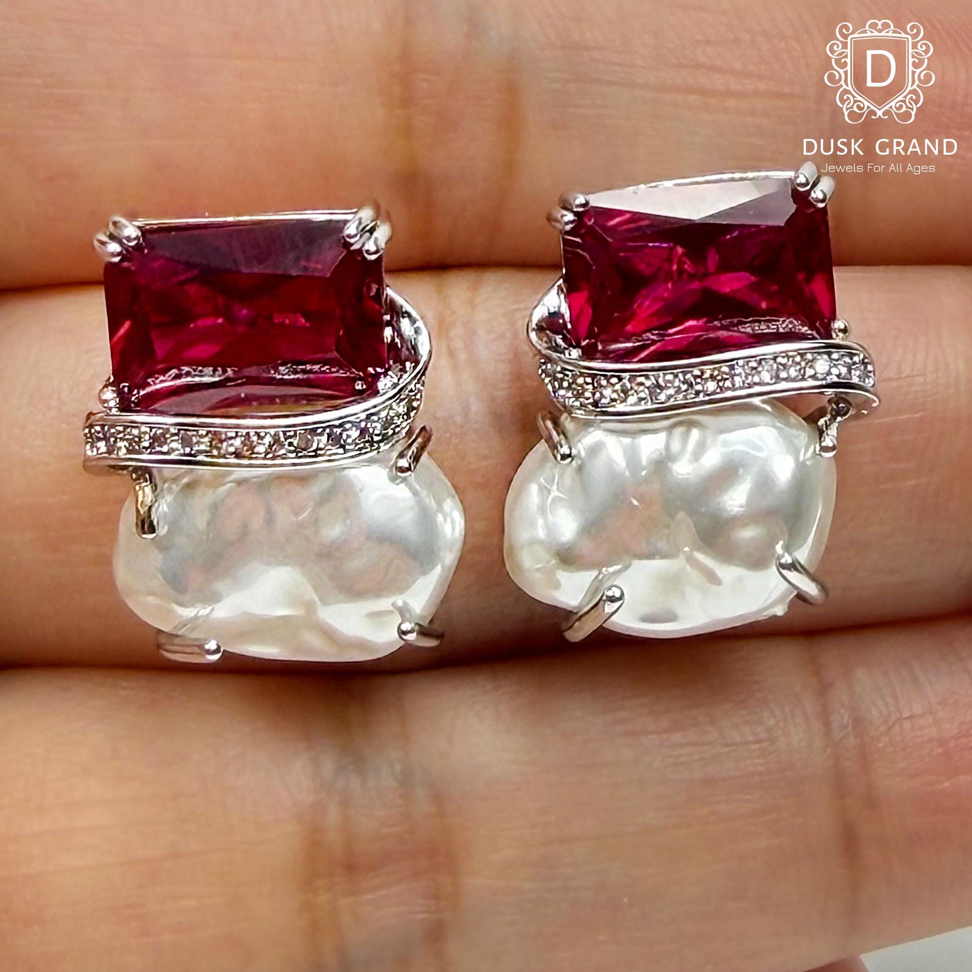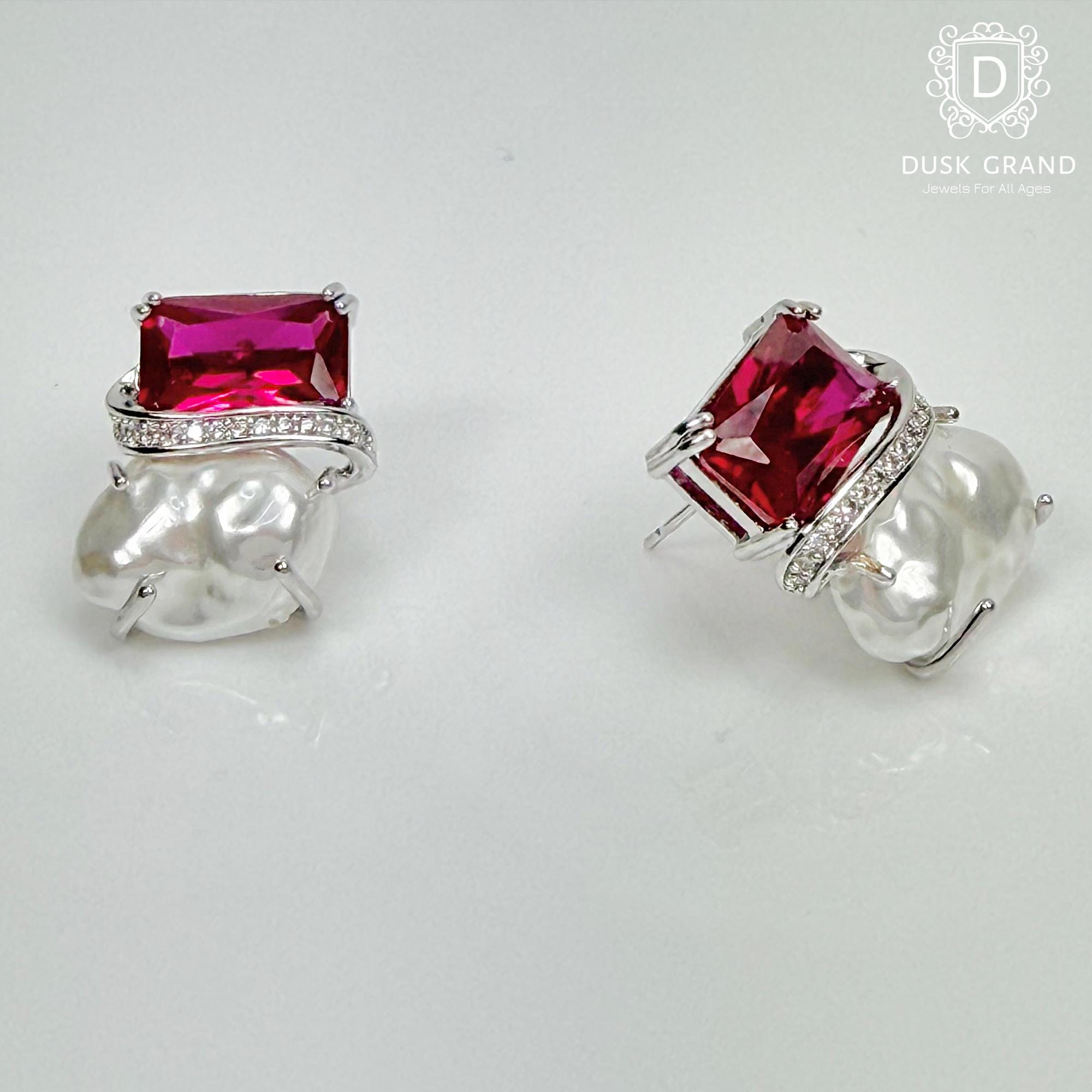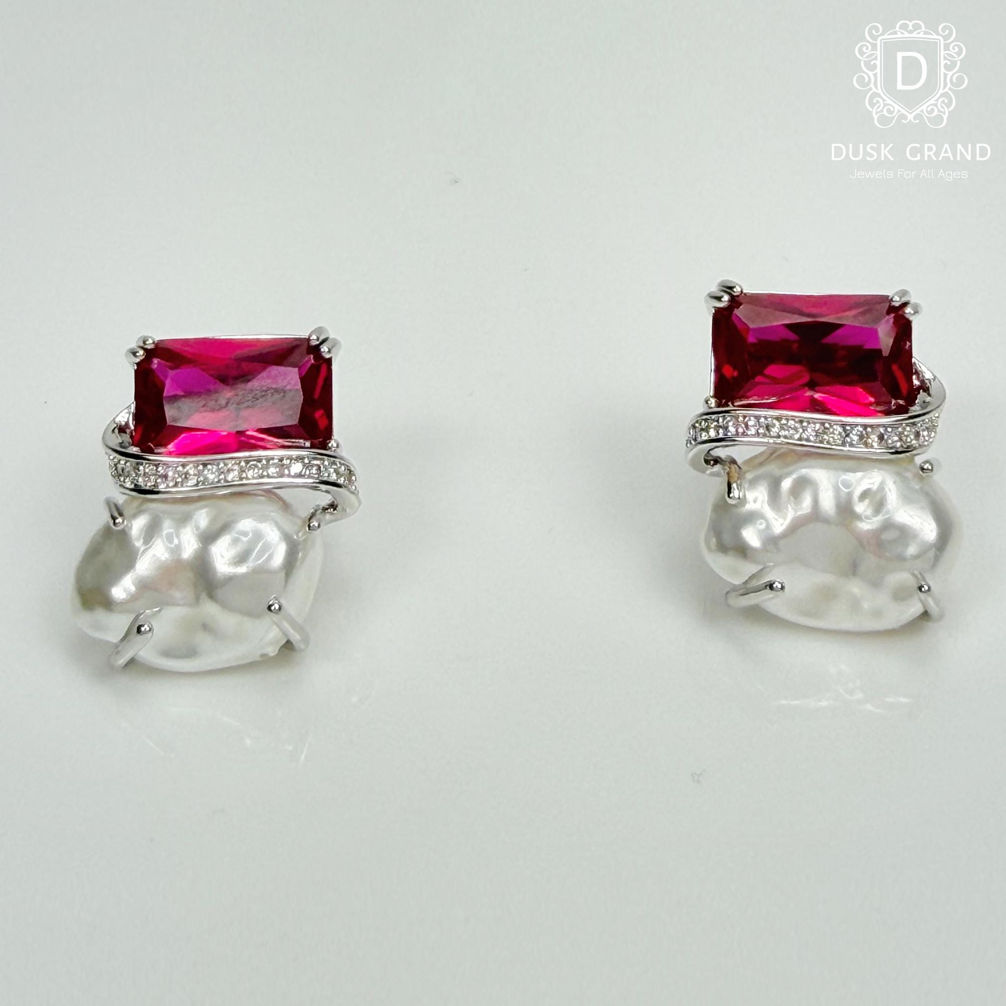 Add refined elegance to your style with these Reddish Pink Crystal and baroque pearl earrings. Each earring showcases a Reddish Pink crystal paired with a natural baroque pearl — creating a luxurious contrast of color and texture.