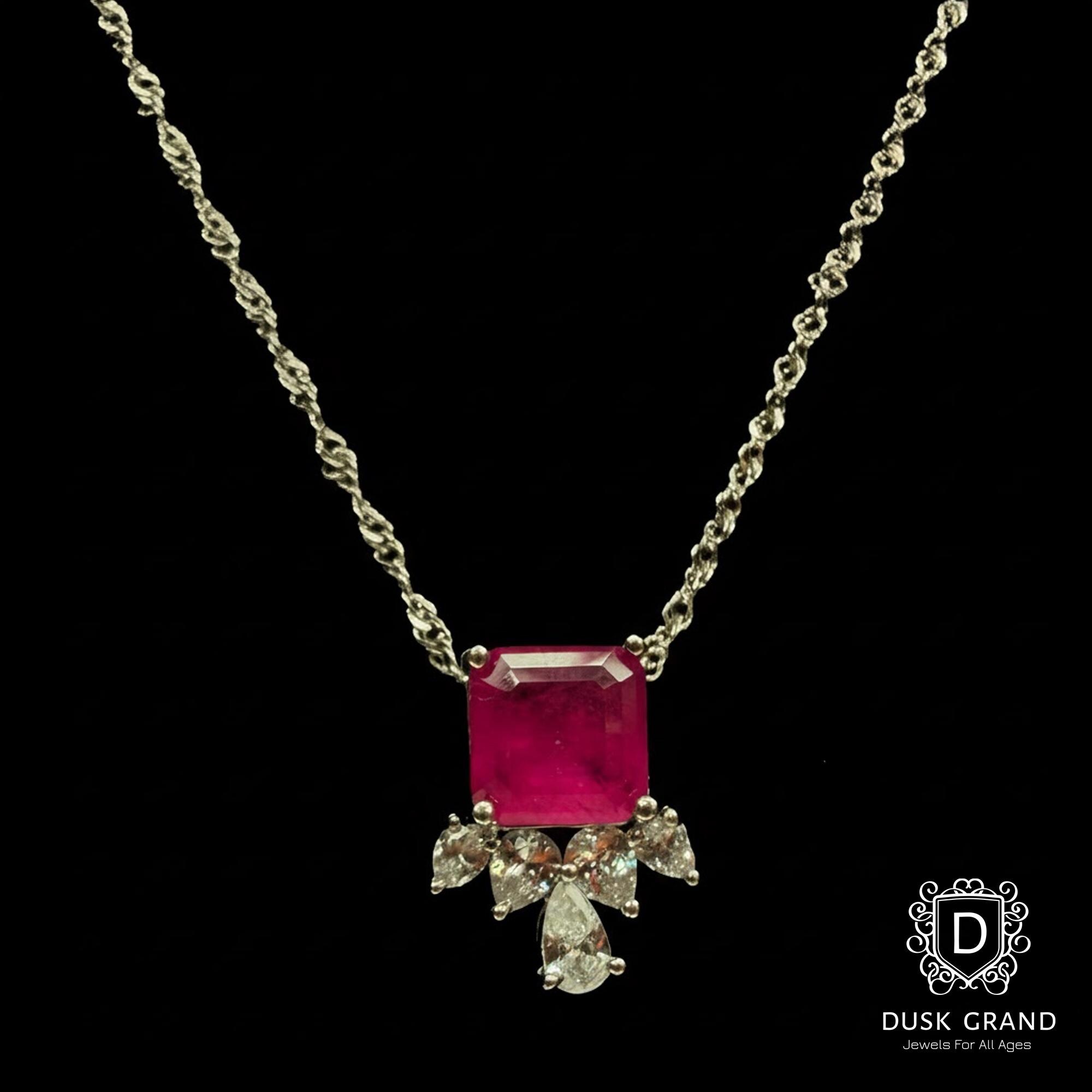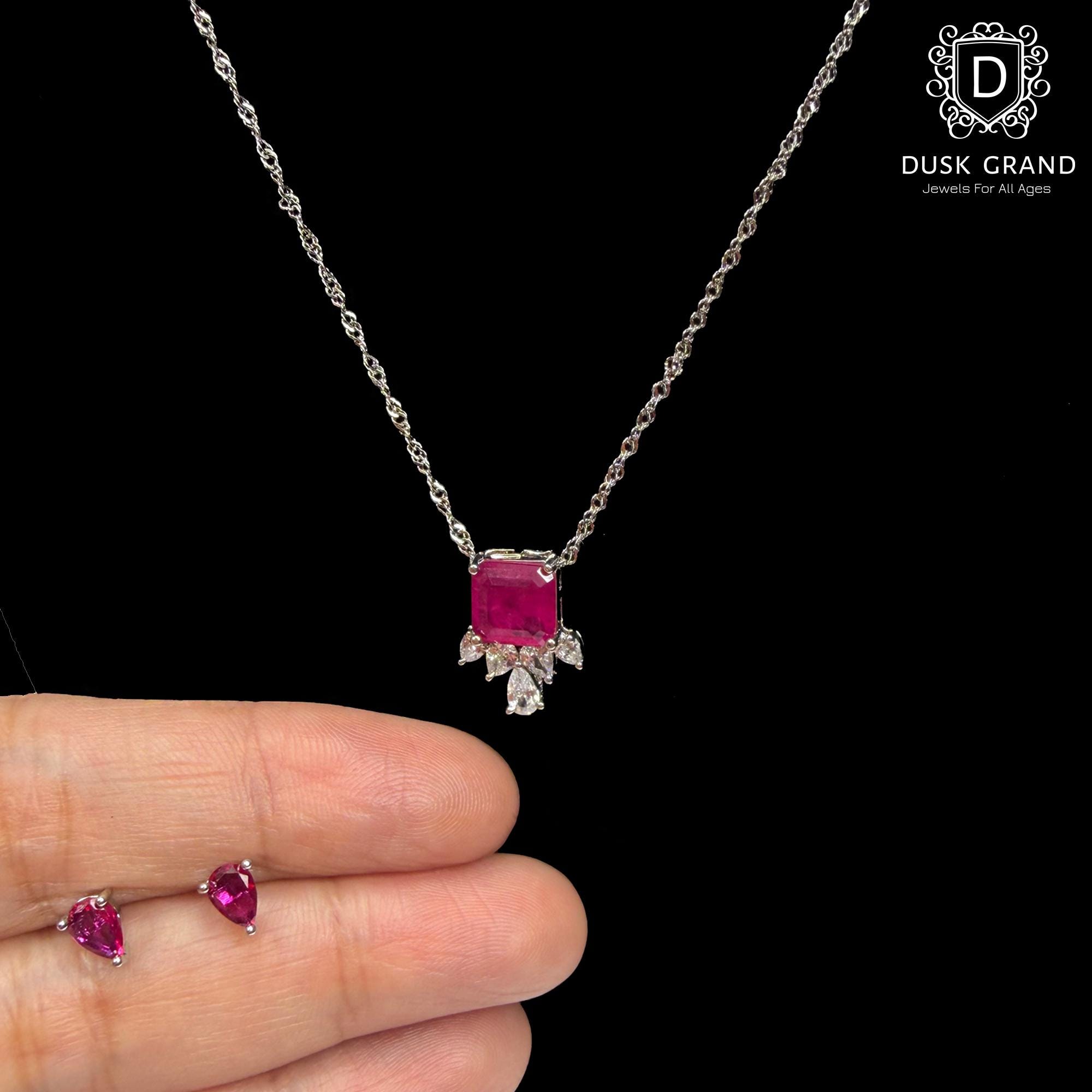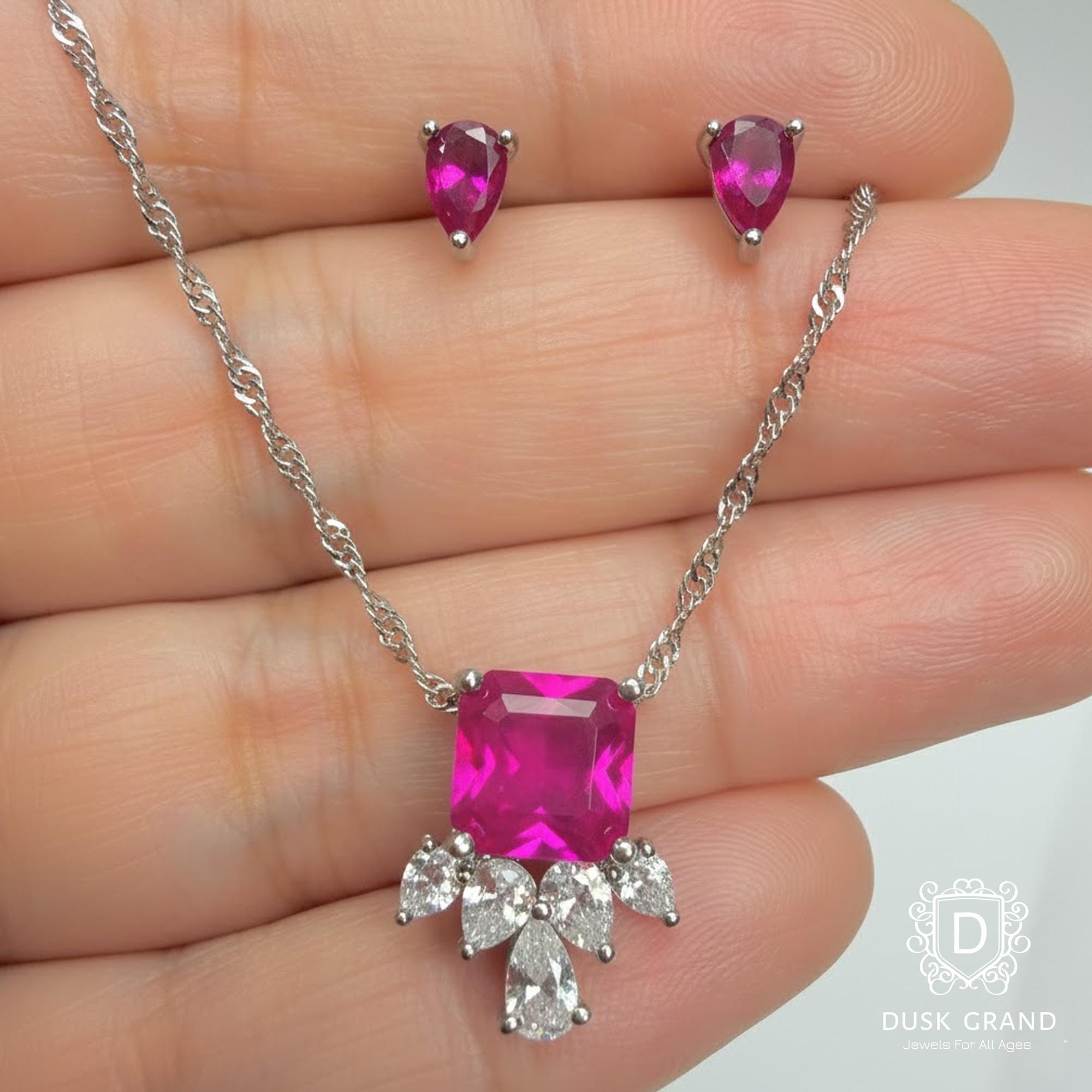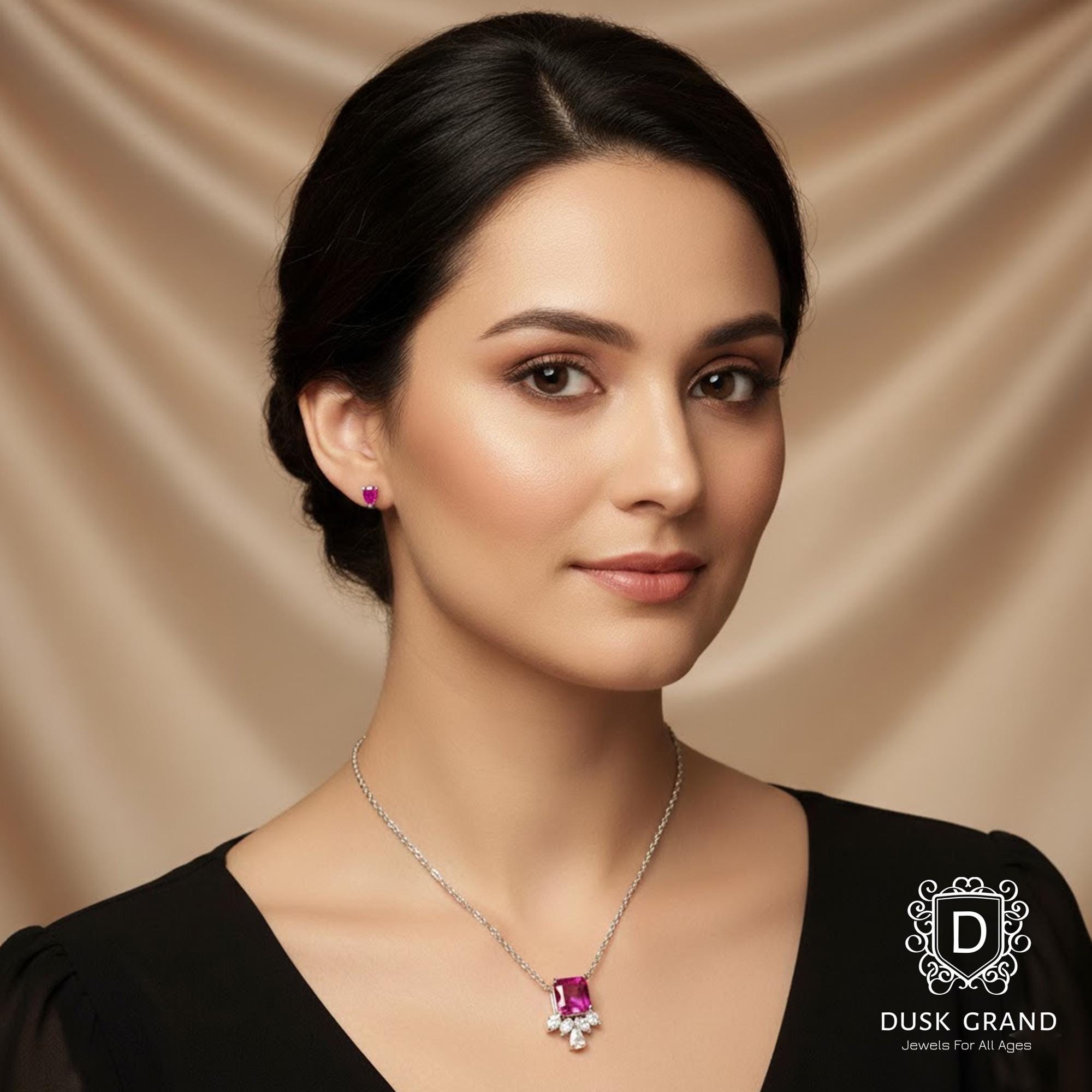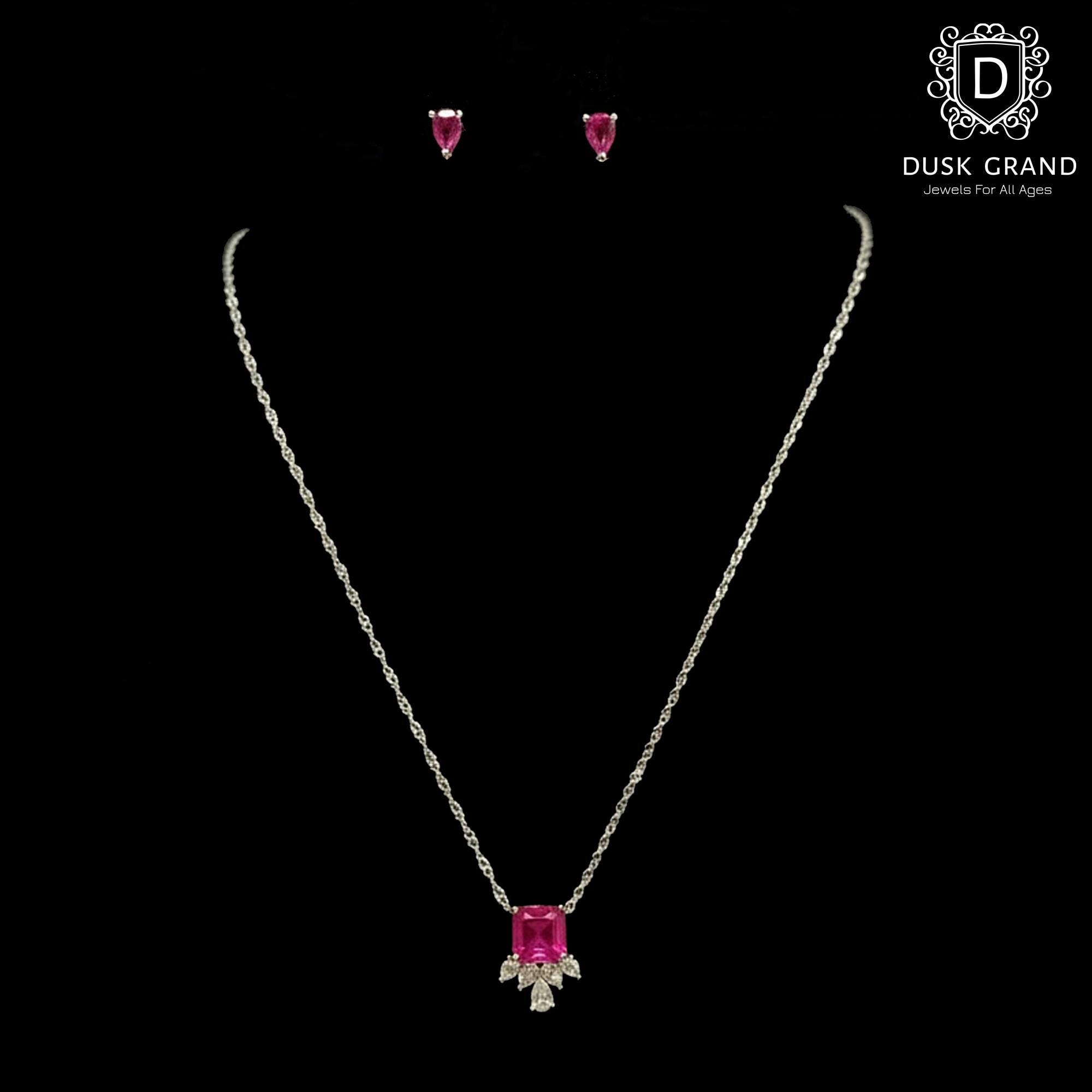 Make a bold statement with this fuchsia pink cubic zirconia necklace and earring set, designed to turn heads with its radiant sparkle. The necklace features a vibrant square-cut pink crystal centerpiece, accented with clear pear-shaped CZ stones that add a touch of luxury and brilliance. Matching teardrop stud earrings complete the elegant set for a perfectly coordinated look.