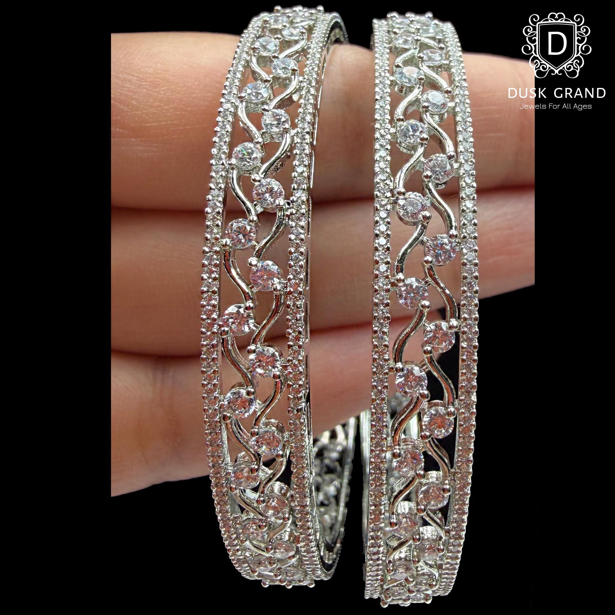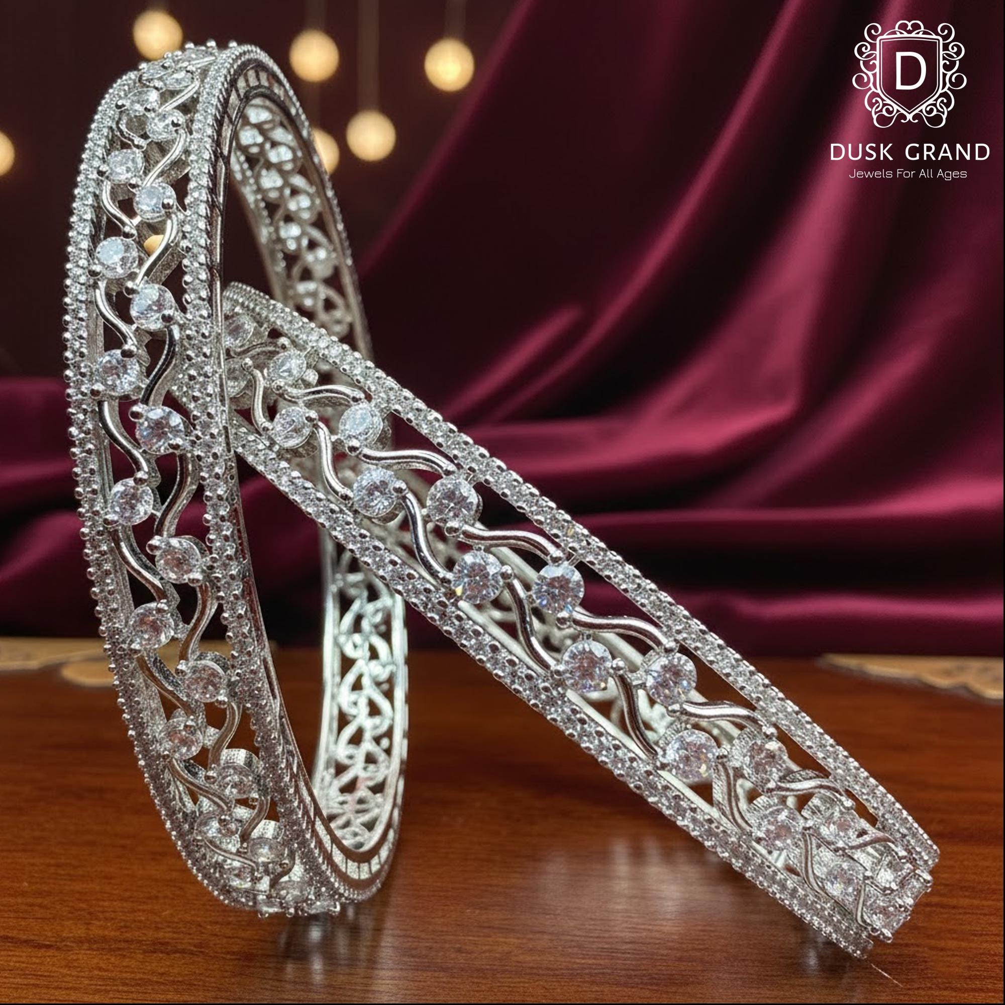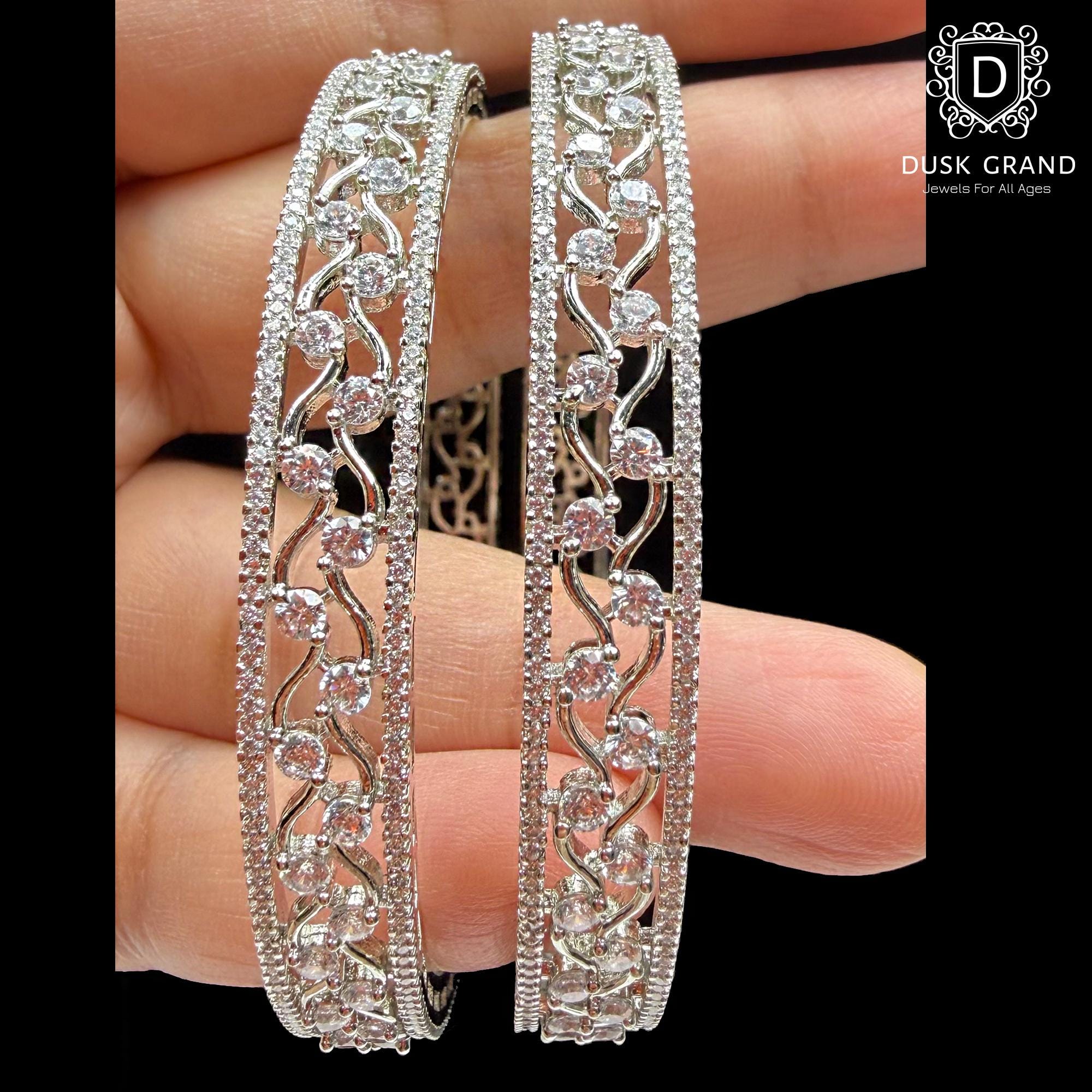 Add timeless sparkle to your look with these exquisite CZ-studded bangles. These designer bangles feature a delicate vine-inspired pattern adorned with brilliant white cubic zirconia stones that shimmer beautifully from every angle.