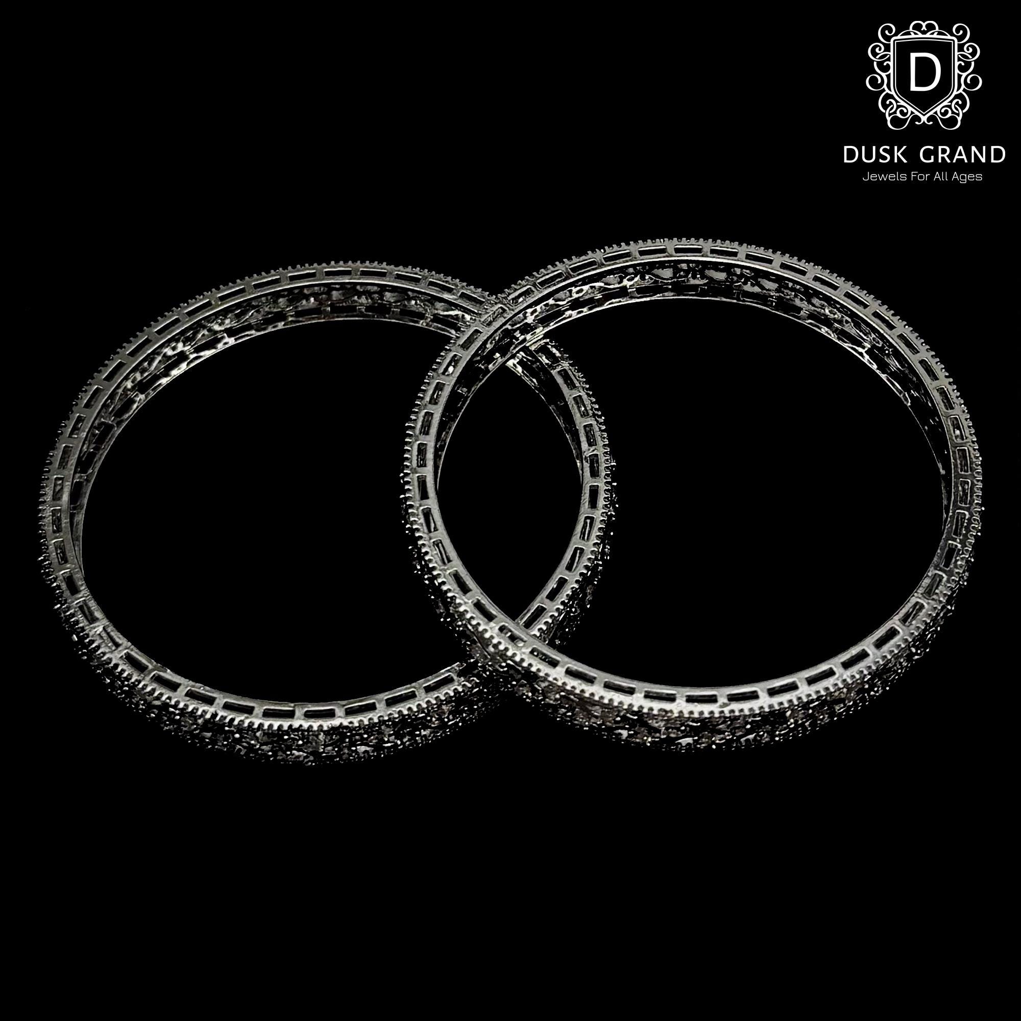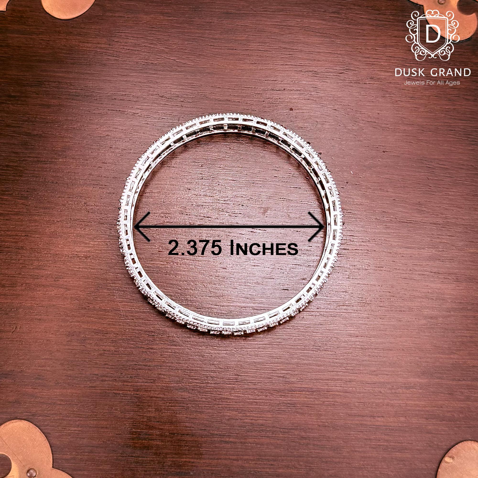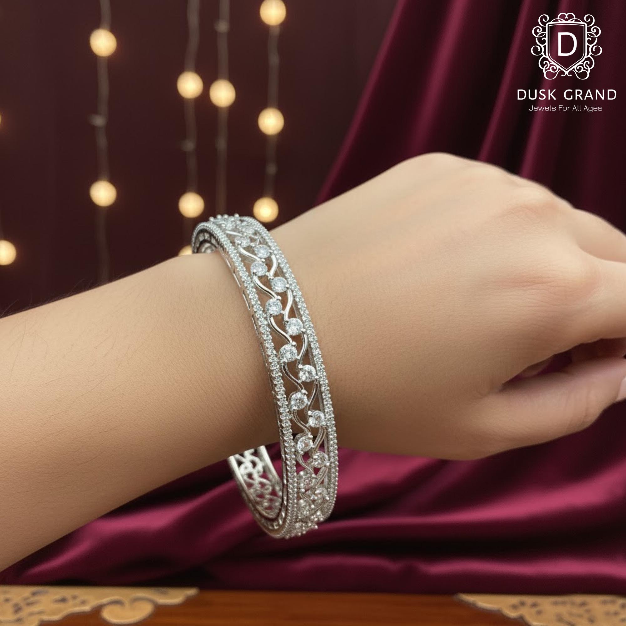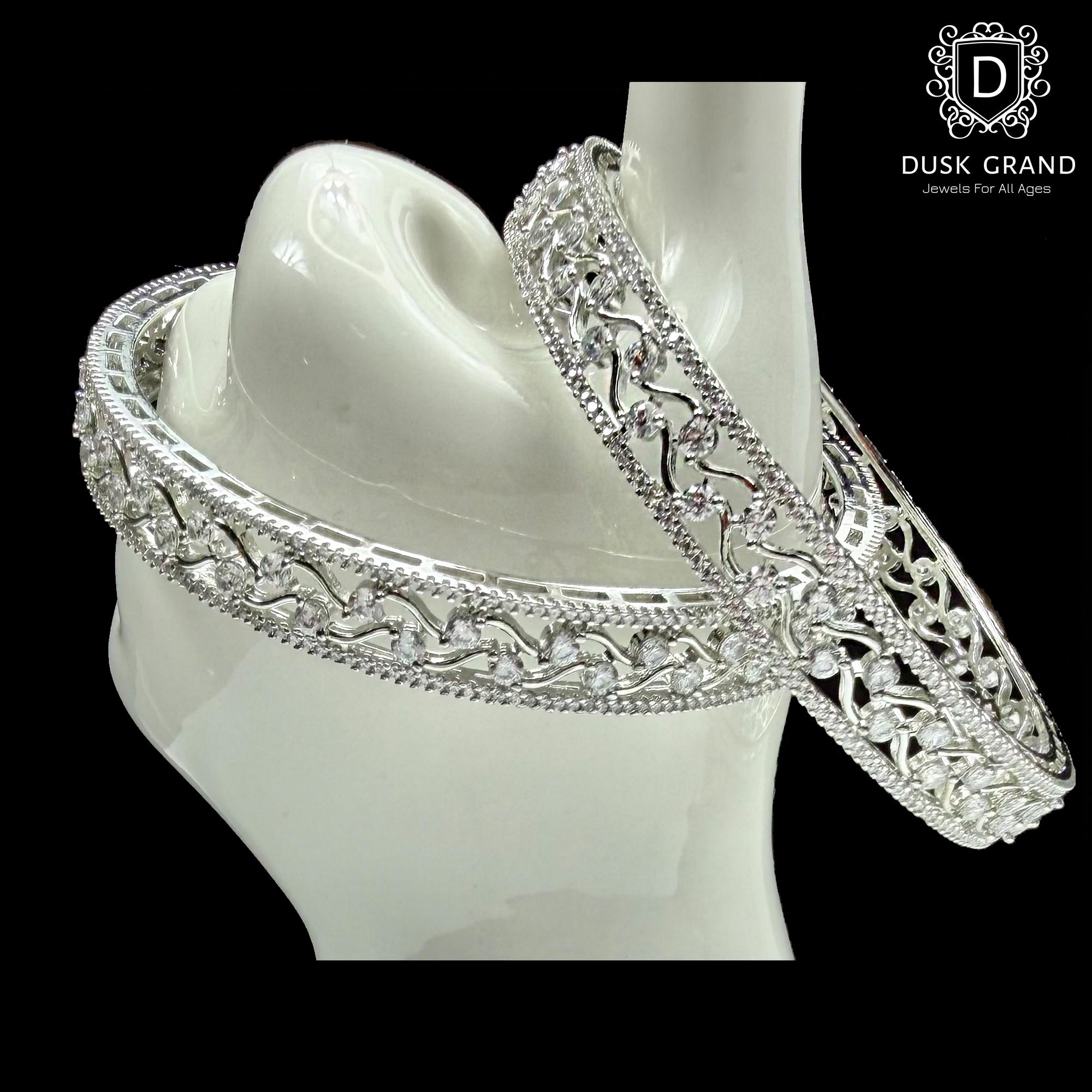 Add timeless sparkle to your look with these exquisite CZ-studded bangles. These designer bangles feature a delicate vine-inspired pattern adorned with brilliant white cubic zirconia stones that shimmer beautifully from every angle.