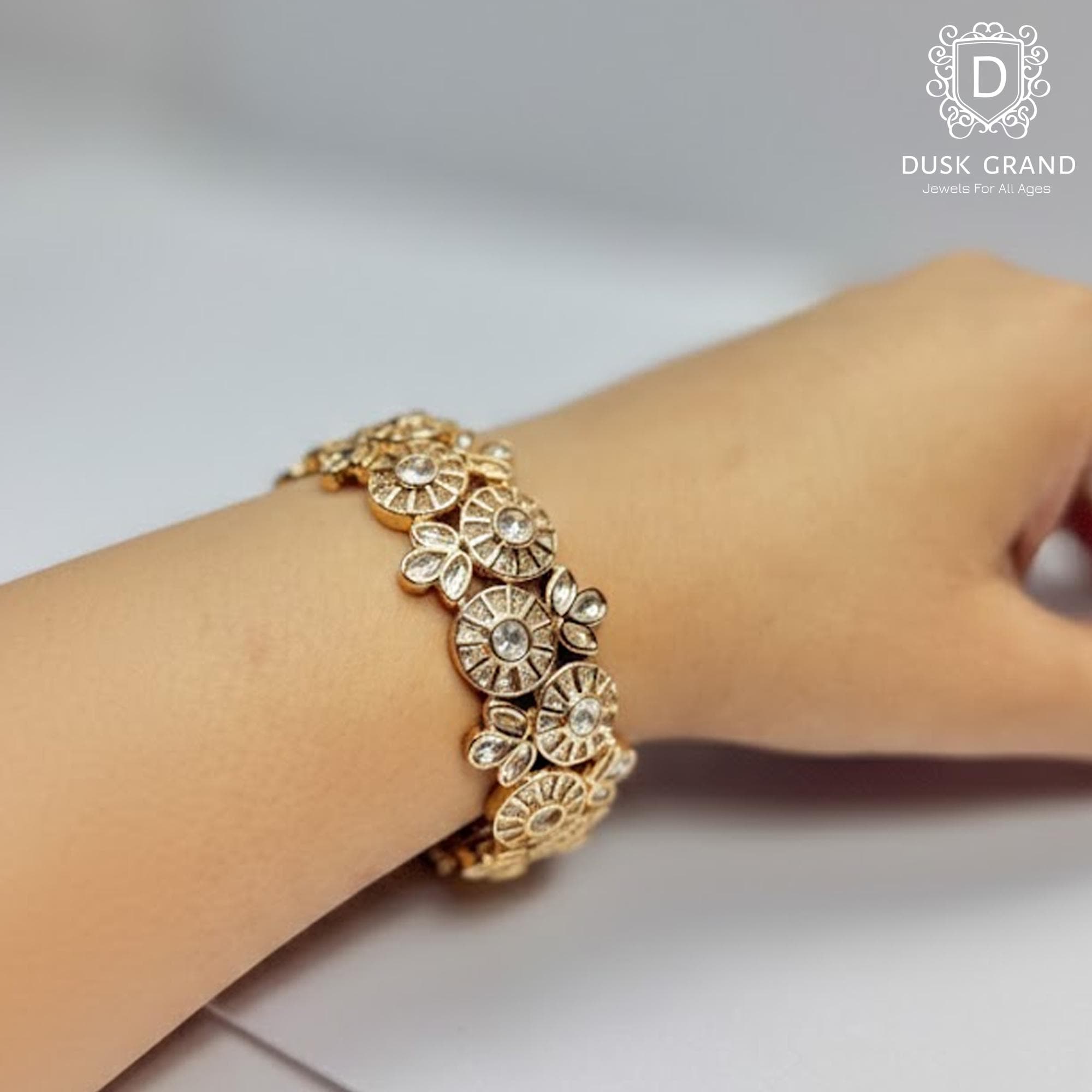 Crafted in a rich gold-tone finish, the bracelet features an adjustable openable screw clasp, making it comfortable and easy to wear. The classic polki design makes it perfect for weddings, festive occasions, parties, and cultural celebrations, while also pairing beautifully with both ethnic and fusion outfits.