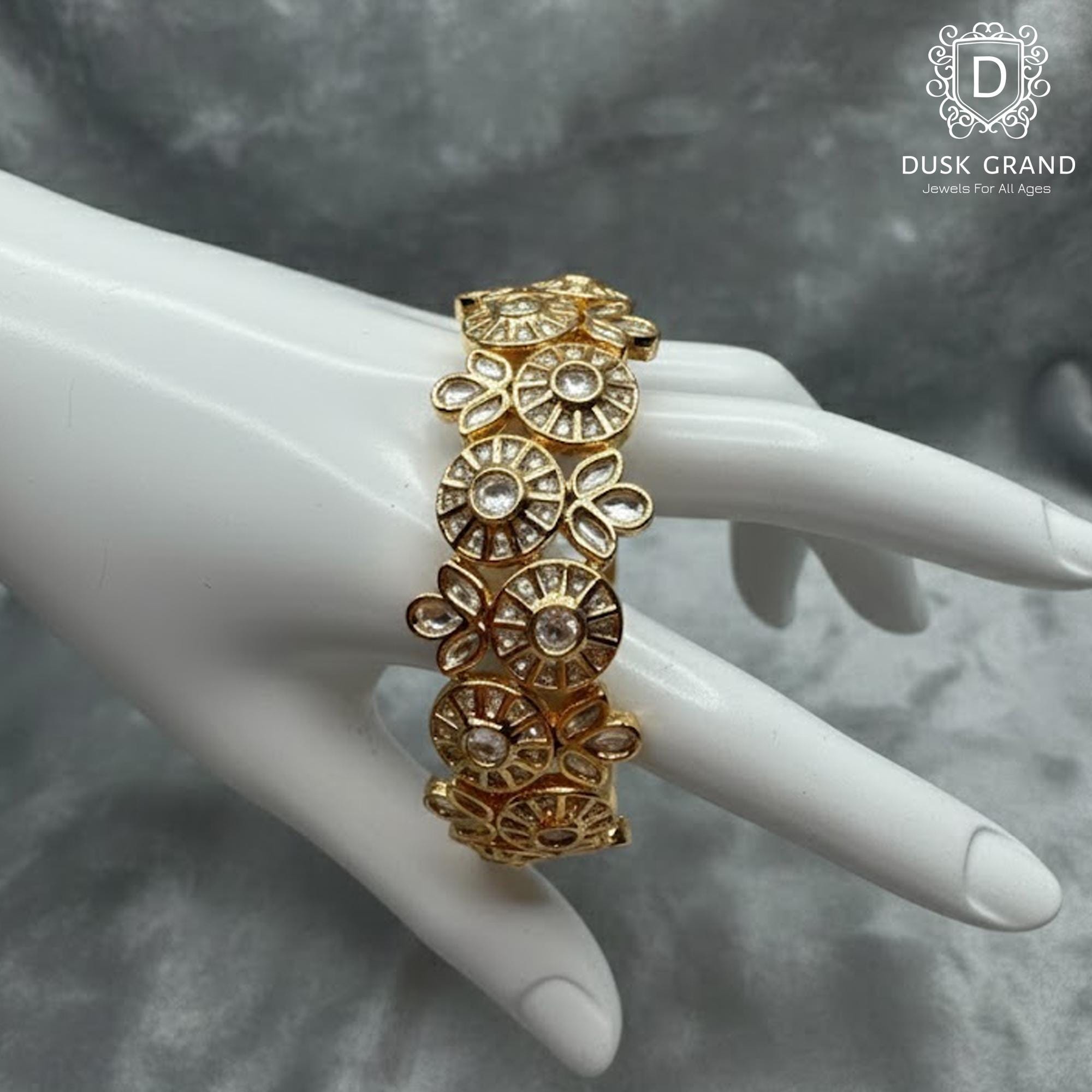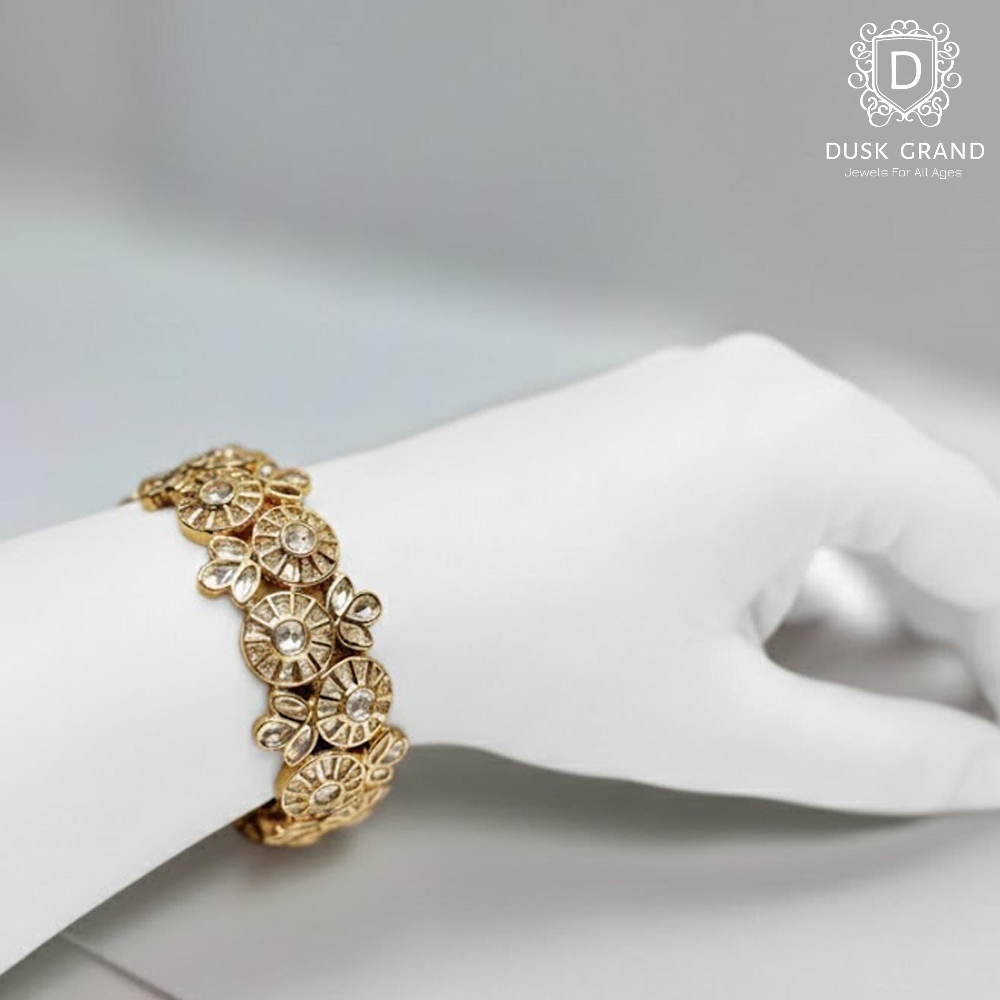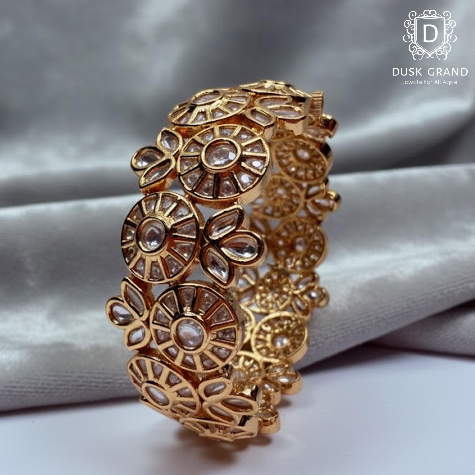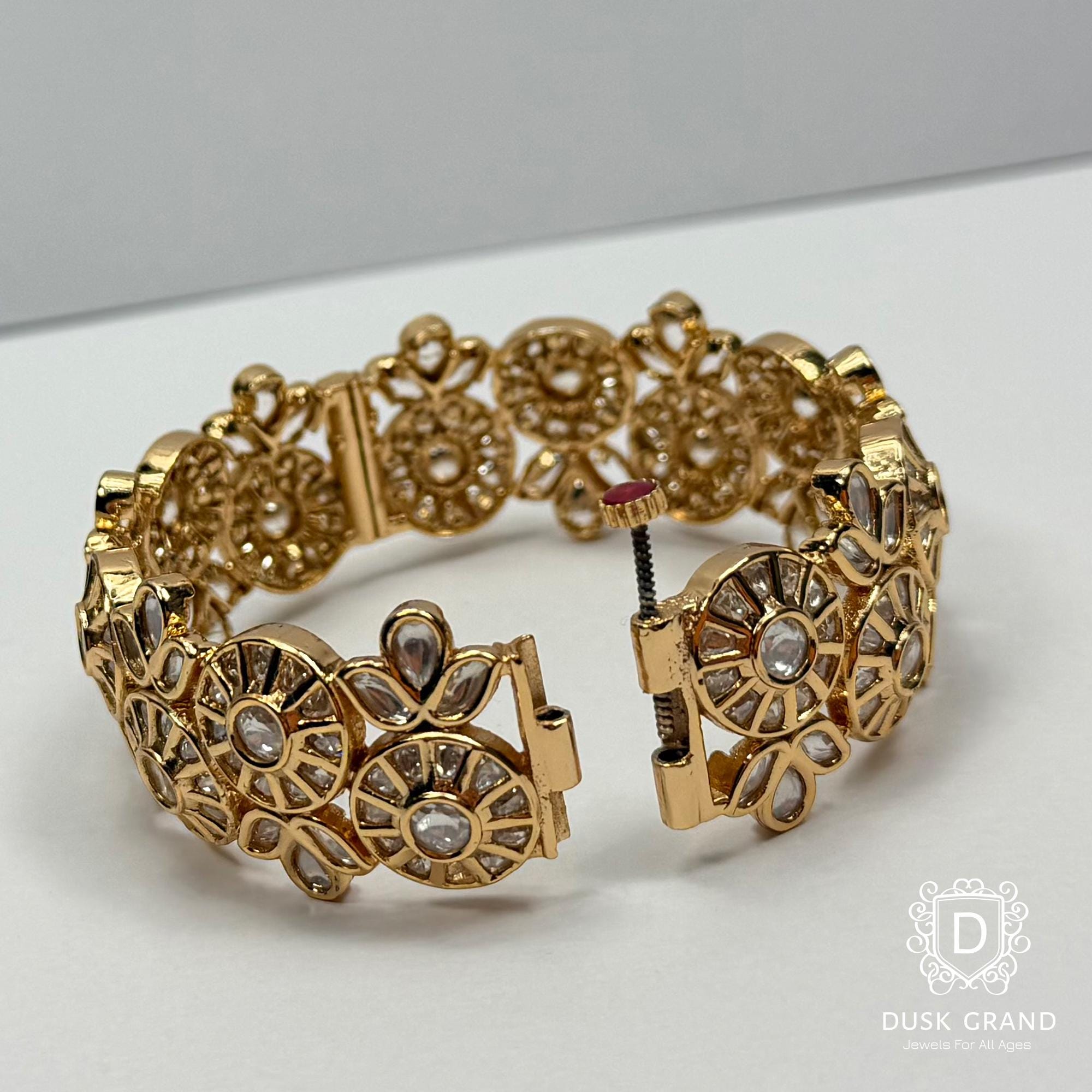 Add timeless elegance to your jewelry collection with this Polki Gold Tone Kada Bracelet, inspired by traditional Indian craftsmanship. Designed with intricate circular motifs and clear polki-style stones, this statement kada reflects regal charm and vintage beauty.